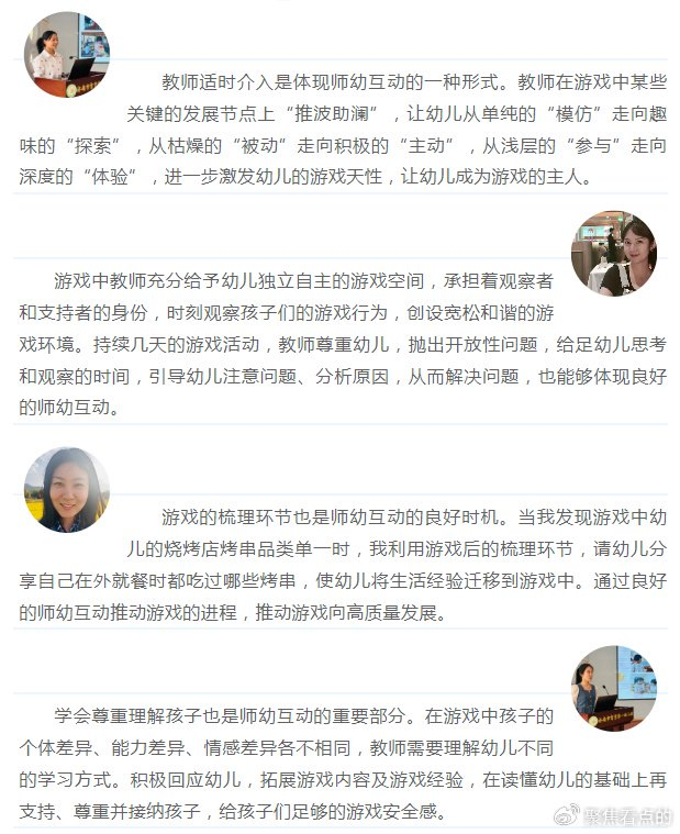 游戏中期,老师们深入游戏现场,开启了游戏现场观摩活动。观摩后,老师们就“游戏中的观察与解读”为切入点进行讨论与交流,对游戏中的观察方法、行为分析、支持策略有了更清晰、明确的认识。