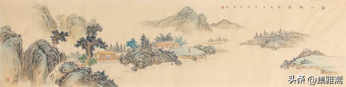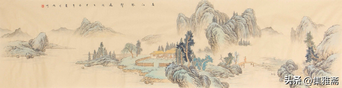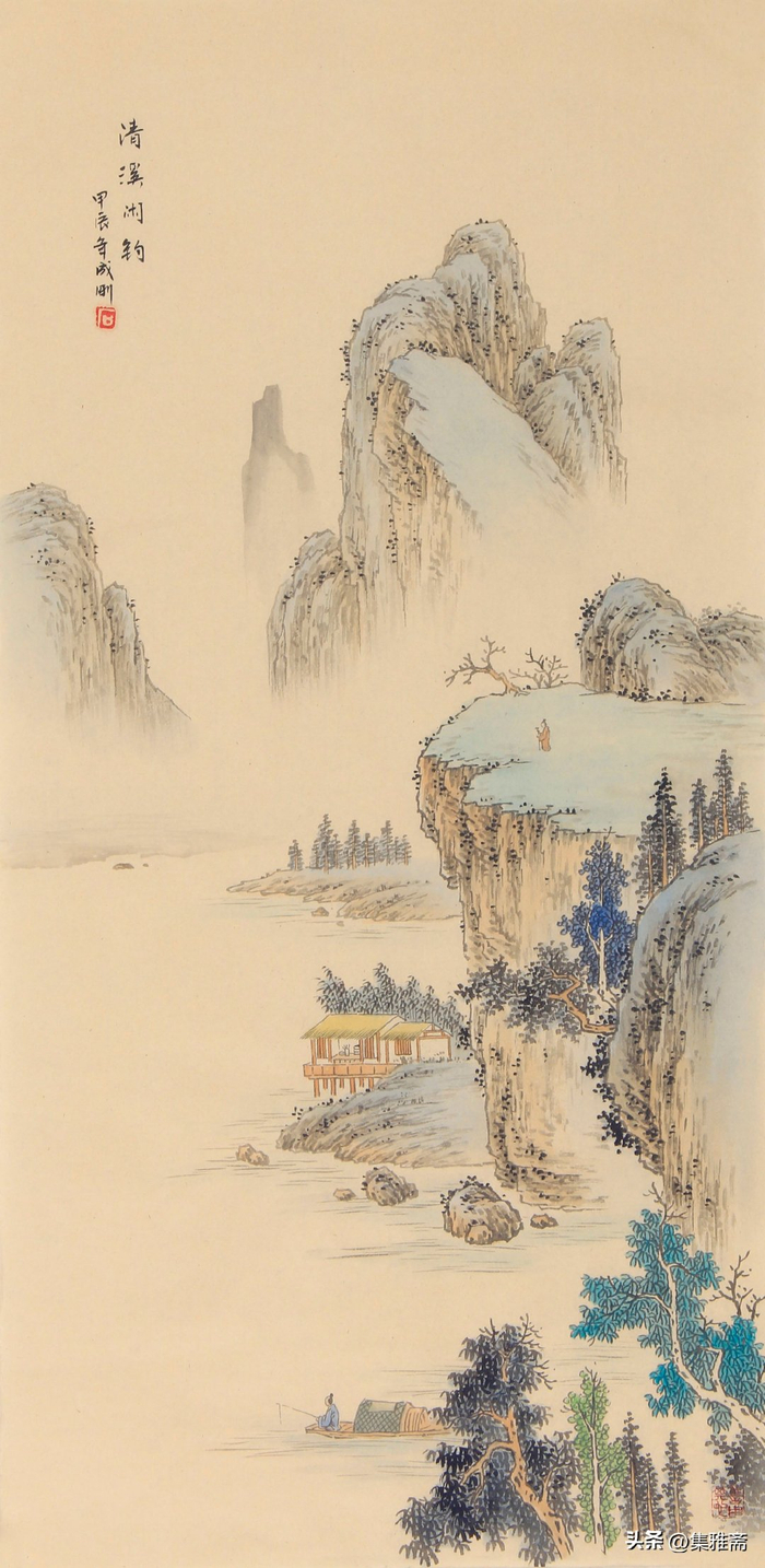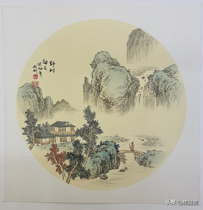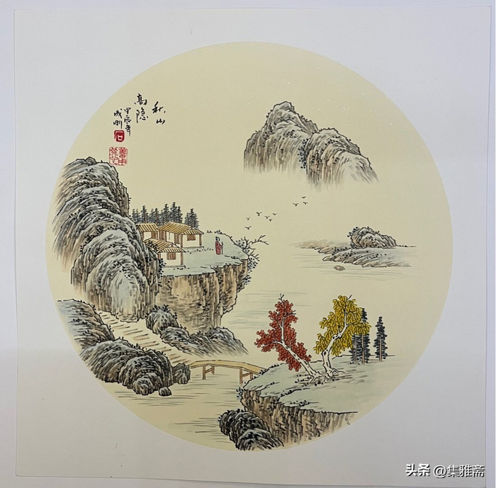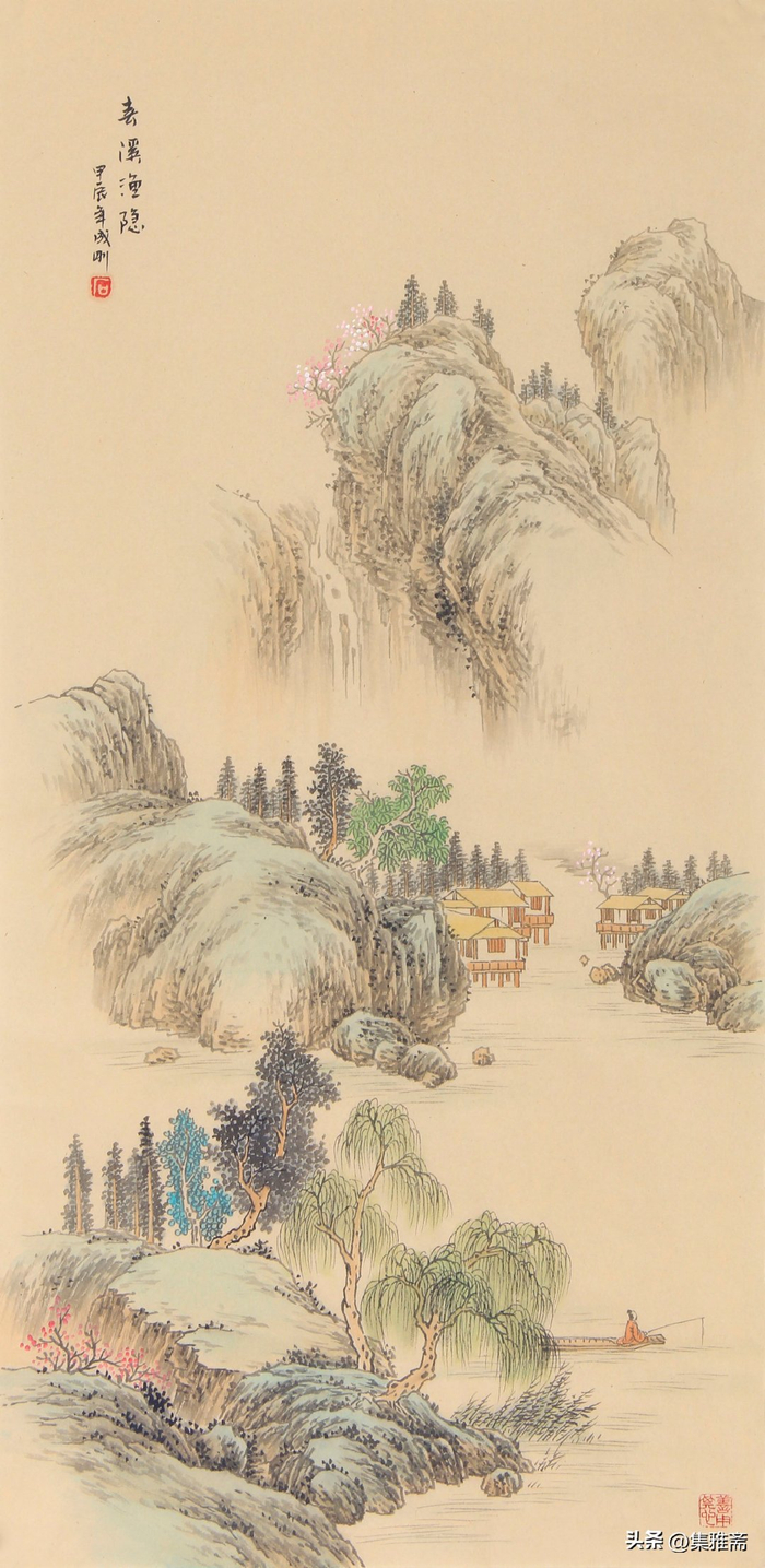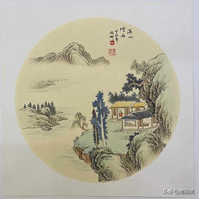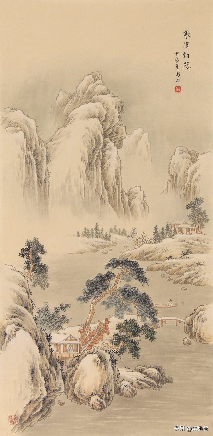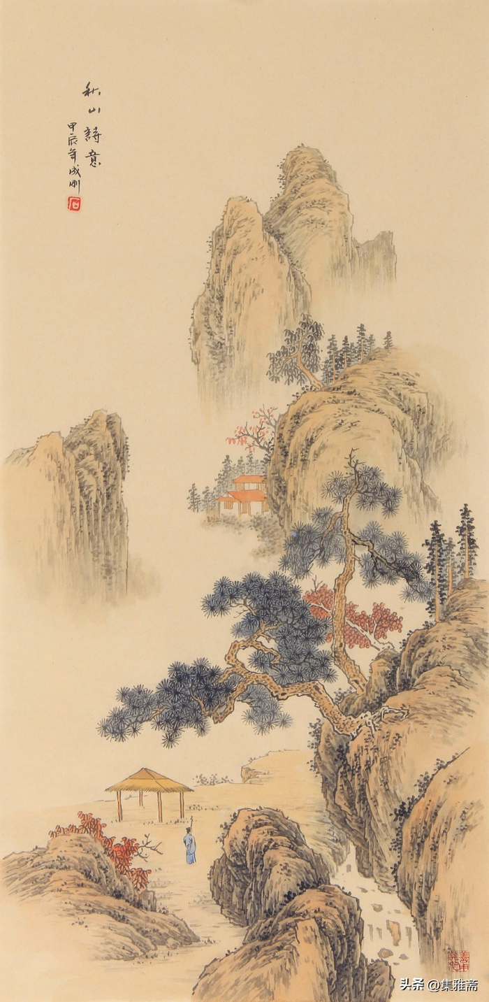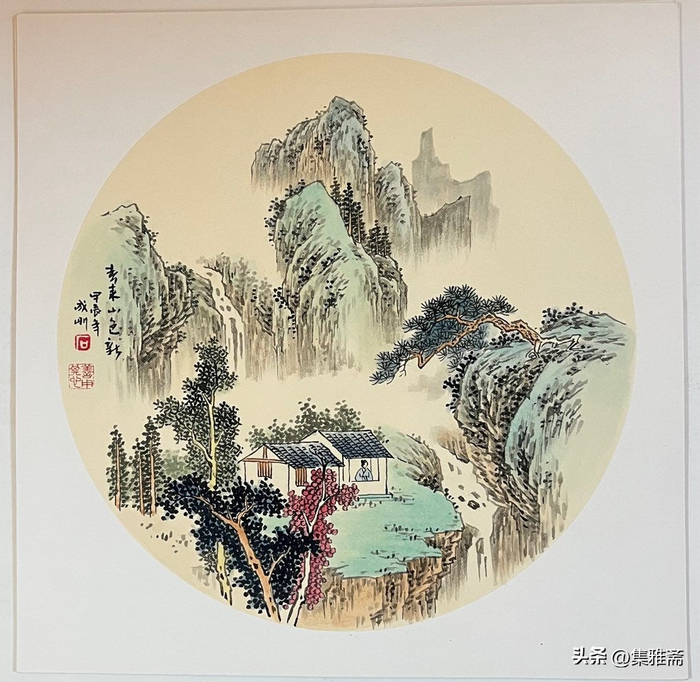 石成刚山水画融浅绛、小青绿技法于一体,景致气脉贯通,咫尺间尽展千里山水之致。画作取传统披麻皴写山石,渴笔焦墨塑树骨,淡墨晕染云雾,赭石、花青轻敷设色,素雅中见温润。构图打破平远、深远的刻板分界,近松、中村、远峦层层铺展,虚实相生。作品既承董其昌、黄宾虹笔墨精神,又融入自身对自然的体察,将传统山水的“意”与“境”精妙结合,是当代文人山水创作中颇具意趣的佳作。