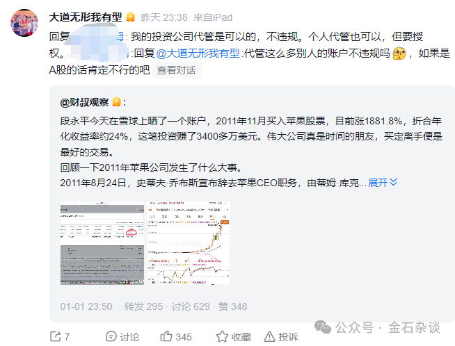 作为个人,不少股民质疑:替别人管理账户是否违规,是否是无照驾驶?段永平也进行了回应:我的投资管理代管是可以的,不违规;个人代管也可以,但要授权。