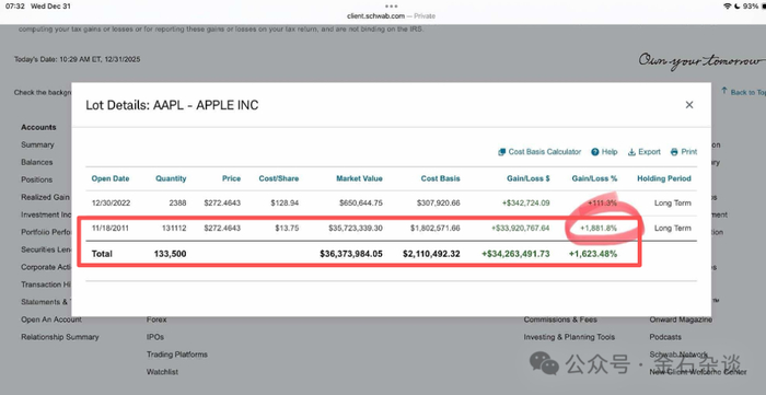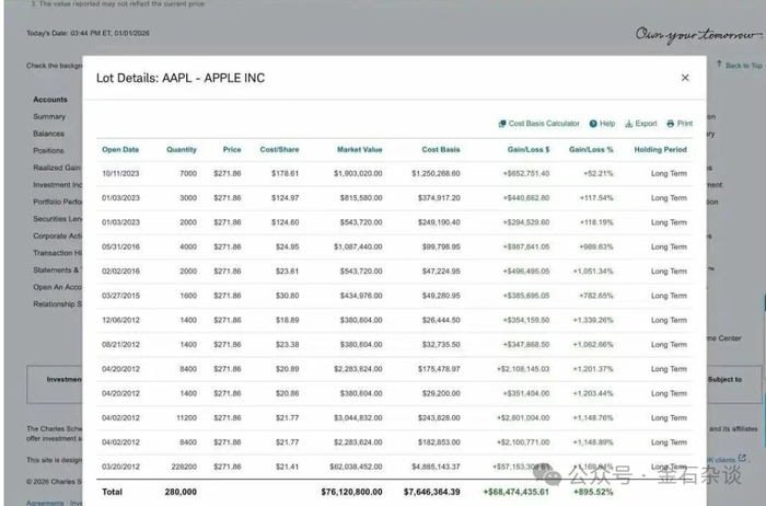 毕竟,段永平管理的不止一个账户,而是有50多个账户,不少还是替别人管理。他晒出的另一只账户(目前已被他删除),同样是持有苹果,持有11年,收益895%,年化大约18%。