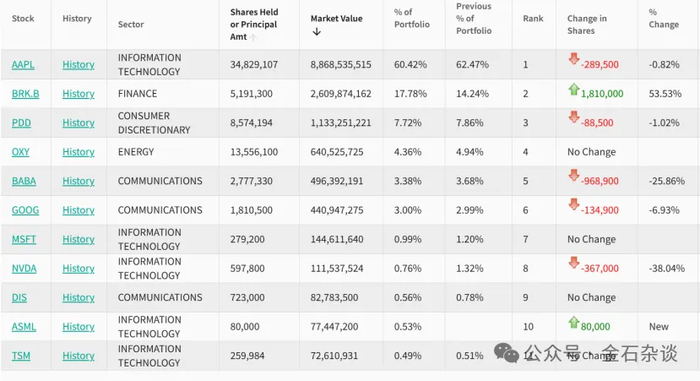 他还增持了巴菲特旗下的伯克希尔,期末持股市值增至26亿美元,占总持仓的比例也升至14.24%,稳居第二大重仓股。