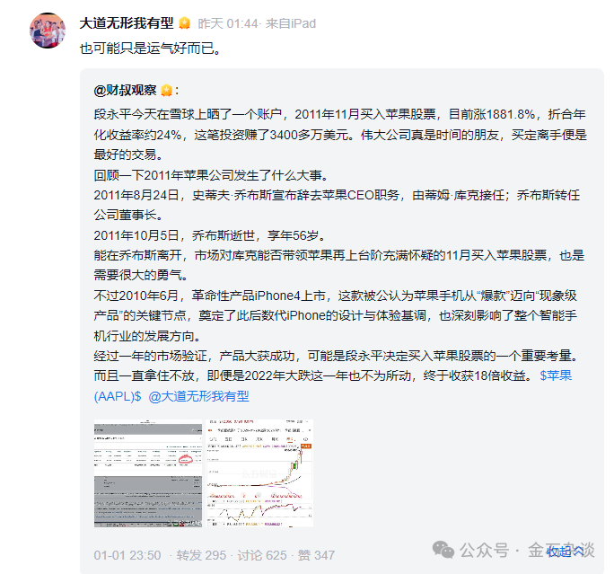 有大V发帖:段永平在雪球晒了一个账户,2011年11月买入苹果,目前涨18881.8%,年化约24%,伟大公司真是时间的朋友,买定离手便是最好的交易。