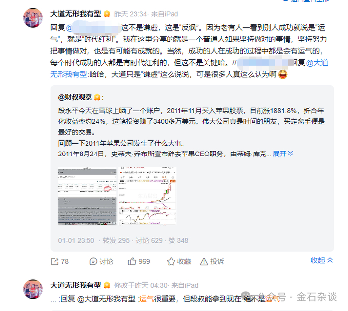 对于段永平“吃时代红利”之说,段永平先是表示“可能只是运气好而已”。后来他回复评论区表示:不是谦虚是反讽,因为老有人一看到别人成功就说是“运气”,就是“时代红利”。我在这里分享的就是一个普通人如果坚持做对的事情,坚持努力把事情做对,也是有可能有成就的。当然,成功的人在成功的过程中都是会有运气的,每个时代成功的人都是有时代红利的,但这不是关键哈。