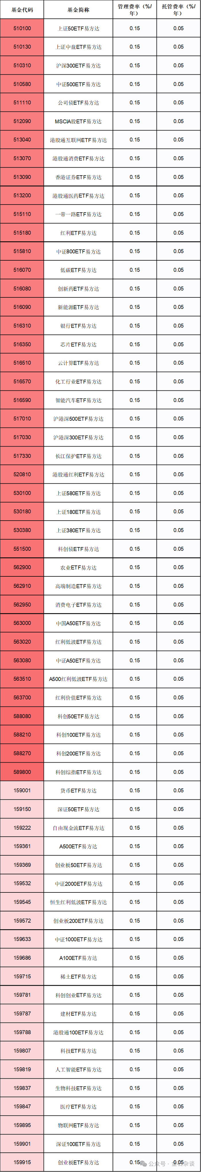 作为公募头部机构,据金石杂谈所知,易方达基金的ETF费率一直很低,非常适合控成本及以低成本购买指数基金的投资者。