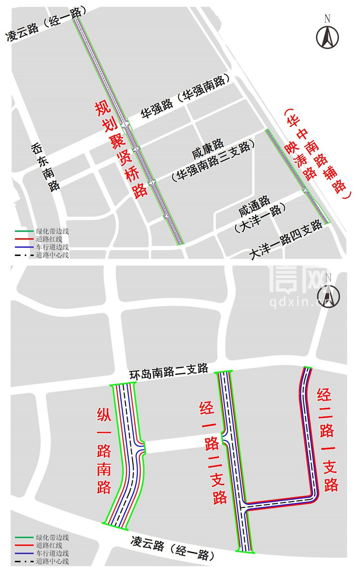 5.经二路一支路(经一路二支路-环岛南路二支路)红线17.5米,双向2车道。