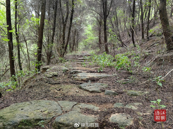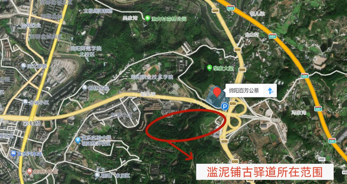 从绵阳城区出发,过仙人桥、经仙人路到百芳公墓附近,右侧山梁一个不起眼的山间小道,就是滥泥铺古驿道所在。