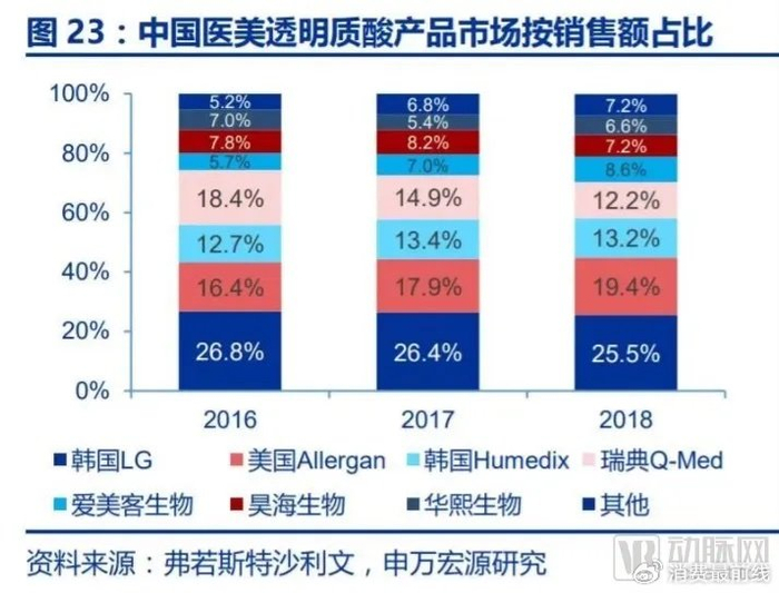 尤其是在医用级玻尿酸。根据沙利文早前的数据显示,我国医美玻尿酸产品按照市场销售额(2018年)占比来看,排在前列的是韩国LG、艾尔建、韩国Humedix、瑞典Q-Med等国外品牌,山东仅有华熙生物,其占比也只有6.6%。而到现在,这种国产品牌盘踞在中低端市场激烈厮杀、高端市场仍由进口品牌把控的状况,非但没有改变,反而更加恶化。