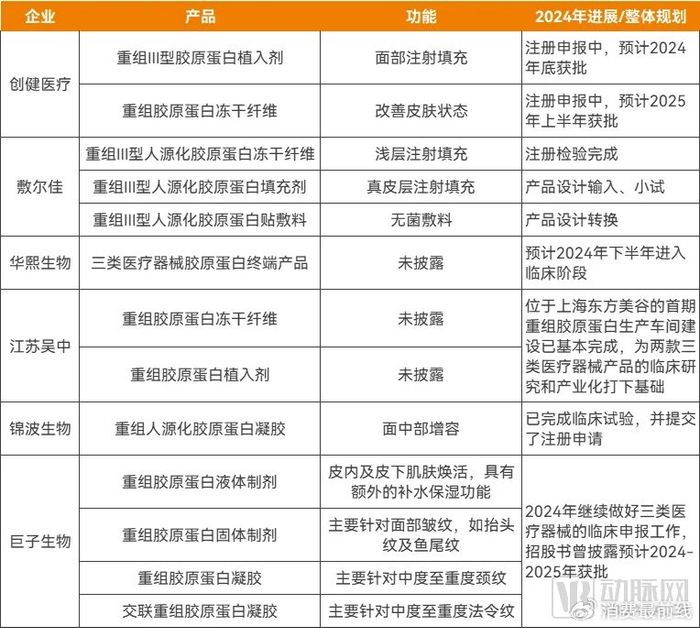 2021年以来,锦波生物凭借独家产品获得业绩快速增长,几乎独占重组胶原蛋白医美注射市场。尽管三类器械证仍然稀缺,但已有众多企业正在追赶,按照已公布的研发进度,预计2024年底至2025年可能迎来一波拿证高峰。