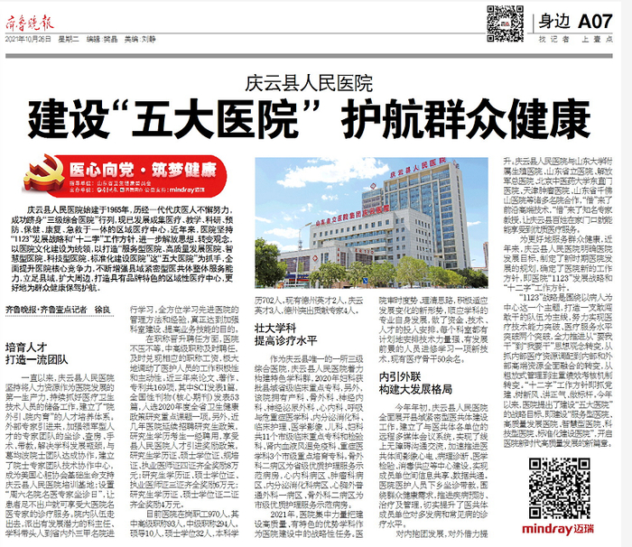 庆云县人民医院始建于1965年,历经一代代庆医人不懈努力,成功跻身“三级综合医院”行列,现已发展成集医疗、教学、科研、预防、保健、康复、急救于一体的区域医疗中心。近年来,医院坚持“1123”发展战略和“十二字”工作方针,进一步解放思想、转变观念,以医院文化建设为统领,以打造“服务型医院、高质量发展医院、智慧型医院、科技型医院、标准化建设医院”这“五大医院”为抓手,全面提升医院核心竞争力,不断增强县域紧密型医共体整体服务能力,立足县域,扩大周边,打造具有品牌特色的区域性医疗中心,更好地为群众健康保驾护航。