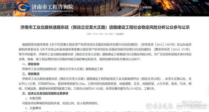 近日,济南市工程咨询院发布《济南市工业北路快速路东延(郭店立交至大正路)道路建设工程社会稳定风险分析公众参与公示》,提到工业北路快速路东延起点在郭店立交以西,终点在大正路以东,全长12.5公里,这与此前提及的道路规模10.8公里不同。除此以外,工业北路东延快速路的具体建设形式目前没有明确公示。