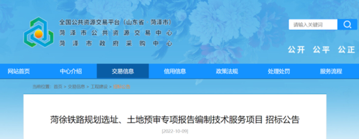 10月9日,《菏徐铁路规划选址、土地预审专项报告编制技术服务项目招标公告》在菏泽市公共资源交易中心网站发布,项目可研前期工作正式启动。