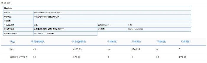 记者了解到,中国铁建花语拾光锦溪项目在济南市住宅与房地产信息平台上的楼盘名称是“济南市历城区土河东A-2地块”,壹粉所购买的是E3#楼。该平台显示,该楼盘仅有E3#栋在售,批准销售套数住宅44套,储藏室13套。其中,住宅0套可售,储藏室还有13套可售。楼盘有预售许可证,取证时间为2021年12月10日。