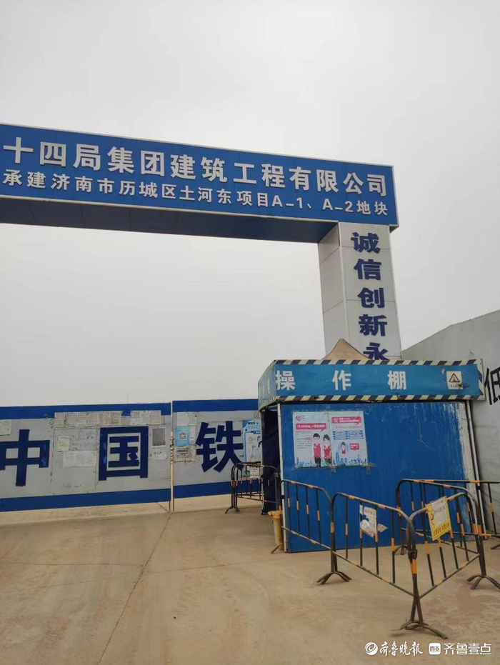 至今一年时间过去,施工现场到底如何?记者27日在写着“中铁十四局集团建筑工程有限公司承建济南市历城区土河东项目A-1、A-2地块”的工地进出口看到,大门已关闭,并贴上了停工字样。大门看门人员称,工地已停工。记者采访的一个上午时间内,没有看到施工车辆进出。在工地围挡外记者发现,东侧的A-2地块仅有一处刚达到基坑最高处,看起来像地下室的在建建筑,旁边还有一处露出钢筋但还未立起建筑的区域,其它则是露出土的大基坑。