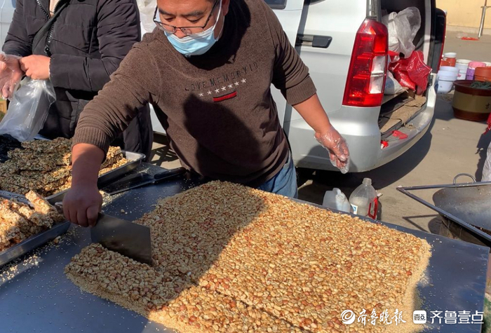 在位于市场南部中间区域的摊贩初先生,将刚出锅的糖米迅速摊平,做了10多年糖米的他,不需要测量,就能把一整块糖米切成大小均匀的54小块,“天气好人特多,和往年腊月二十六七差不多。”而在旁边的摊贩张先生,已将海阳西红柿基本卖空了,“这边集大,人多,今天带来800多斤,三个多小时,基本卖完了。”