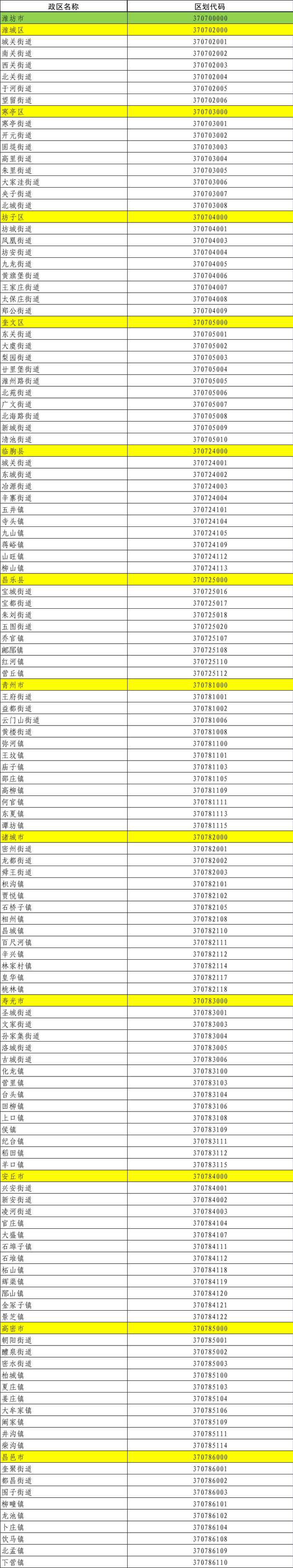 山东省县级以下行政区划代码表(潍坊市部分)