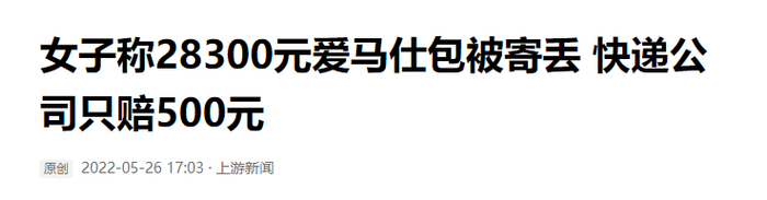 无独有偶,去年5月16日,在广州做网店的李女士通过闲鱼售出的价值28300元的二手爱马仕包,却被顺丰快递寄丢了。事后她找快递公司理论,却得到了只赔偿保价金额500元的回答。