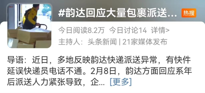 大量用户在社交平台上反映,自2023年1月起韵达即出现了派件异常,春节后这一情况非但未缓解,反而持续加剧。