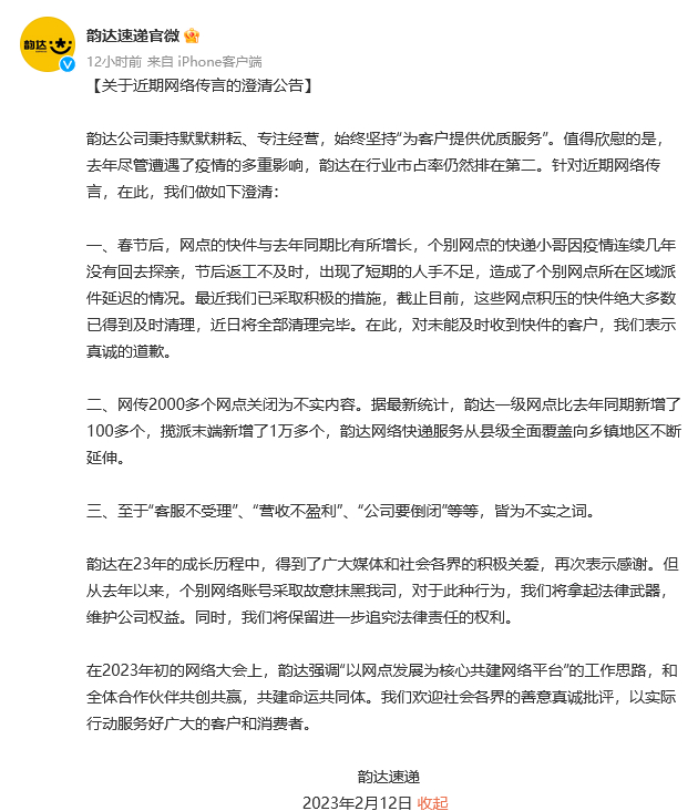 对此,韵达速递官微12日发布澄清公告,网传2000多个网点关闭为不实内容,“客服不受理”、“营收不盈利”、“公司要倒闭”等等,皆为不实之词。