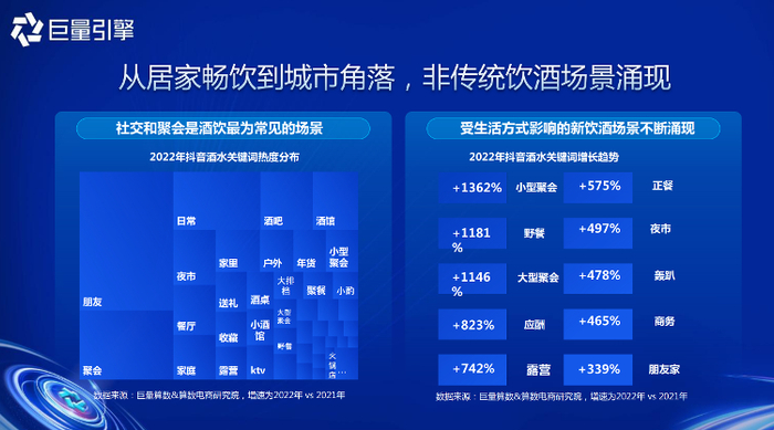 巨量引擎近期公布的酒水趋势洞察报告显示,与2021年相比,受生活方式的影响,非传统酒饮场景正在快速涌现,其中小型聚会(1362%)、野餐(1181%)、露营(742%)、夜市(497%)、轰趴(478%)等抖音酒水关键词增长明显。