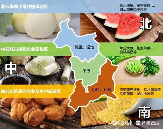 引导“北-中-南”特色农业布局:北部优质瓜菜种植体验区(黄河西瓜、高官寨甜瓜、 白云湖生态甲鱼等);中部城市精致农业聚集区(章丘大葱、鲍家芹菜、 昊林果品等);南部山区旱作农业及乡村旅游区(曹范薄壳核桃、赵八洞香椿、 文祖花椒、龙山小米等)。