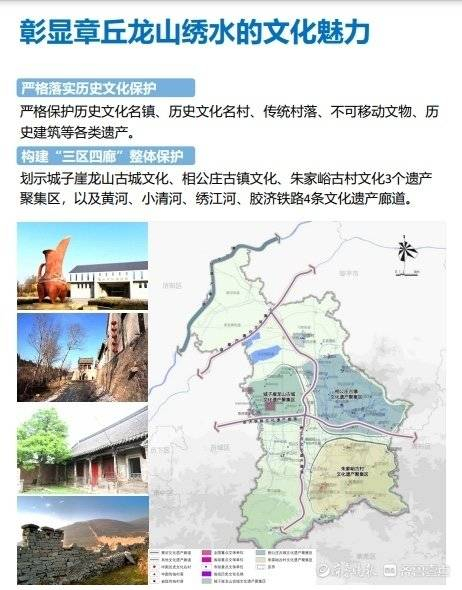 在文化方面,规划突出彰显章丘龙山绣水的文化魅力。严格保护历史文化名镇、历史文化名村、传统村落、不可移动文物、历史建筑等各类遗产。规划城子崖龙山古城文化、相公庄古镇文化、朱家峪古村文化3个遗产聚集区,以及黄河、小清河、绣江河、胶济铁路4条文化遗产廊道。