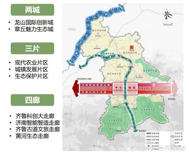 这份规划明确了章丘“一河两城”城区布局,中心城区以绣源河为轴划分为“一河两城”:西边是章丘魅力生态城,东边是龙山国际创新城。通过明水古城国际旅游度假区、山东大学龙山校区(创新港)等要素,加快形成东西互动、比翼齐飞的协调发展局面。