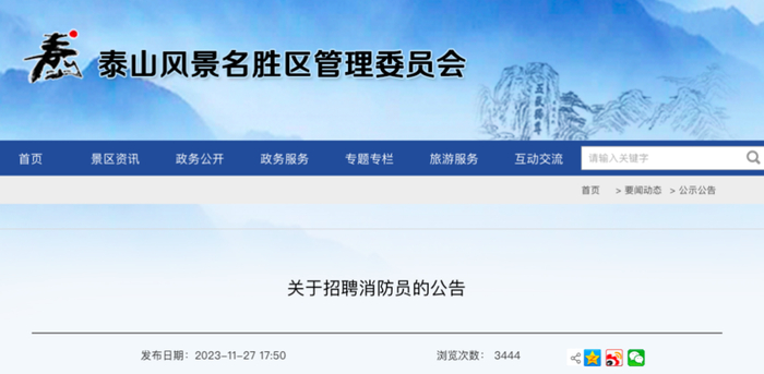 公告称,因工作需要,泰安市利泰人力资源有限公司现面向社会公开招聘消防员,派遣到泰山景区相关单位,招聘森林消防员37名,消防文员13名。