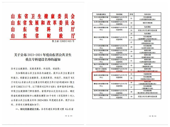 12月7日,省卫生健康委、省发展改革委、省科技厅、省财政厅联合下发《关于公布2023-2024年度山东省公共卫生重点专科建设名单的通知》,市疾控中心艾滋病防制和传染病防制两个专科获批省级公共卫生重点专科建设项目,入选数量位居全省前列,充分彰显了中心重点专科建设实力,对于持续提升公共卫生服务能力、促进疾控事业高质量发展具有重要意义。