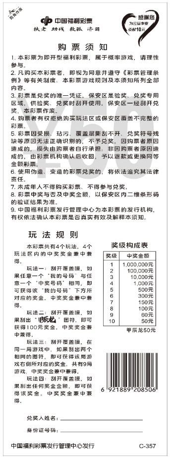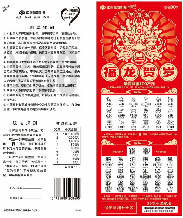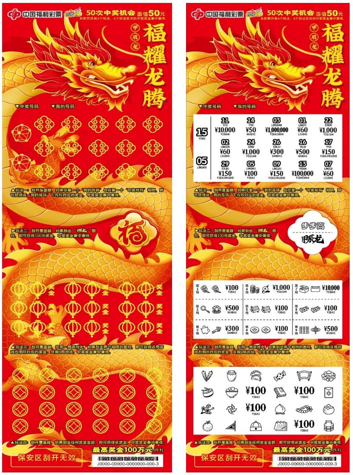 该游戏票面将龙的动作设计为正在向上腾飞的造型,金龙向上的气势磅礴,彰显威武和庄严。画面整体视觉更加舒展、大气,寓意龙年蒸蒸日上,福气满满。用喜庆红色作为底色,烘托新年的喜庆氛围。四个玩法区以中国结、福字、灯笼、钱币作为图幅,红黄交映,彰显出繁荣喜庆之气。该游戏最高奖金100万元,奖级10级,共50次中奖机会。本彩票共有4个玩法,4个玩法区内的中奖奖金兼中兼得。玩法一:刮开覆盖膜,如果任意一个“我的号码”与任意一个“中奖号码”相同,即可获得该“我的号码”下方所对应的奖金。中奖奖金兼中兼得。玩法二:刮开覆盖膜,如果刮出“