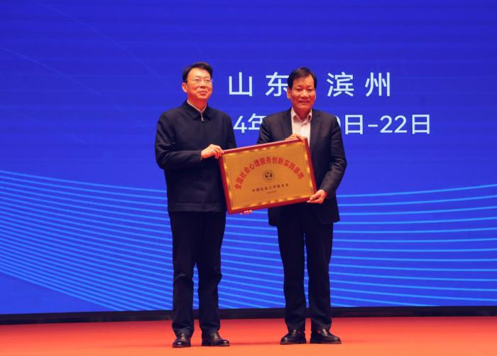 中国社会工作联合会会长陈存根为滨州市授予“中国社会心理服务创新实践基地”牌匾,市委副书记刘忠远代表滨州市上台接牌