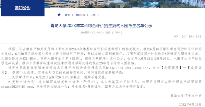 测试结束后,根据综合素质测试成绩由高到低,原则上按照不超过招生计划数的6倍确定入围名单。入围考生名单在教育部阳光高考信息公开平台及学校本科招生网上进行公示,并报山东省教育招生考试院核准备案。
