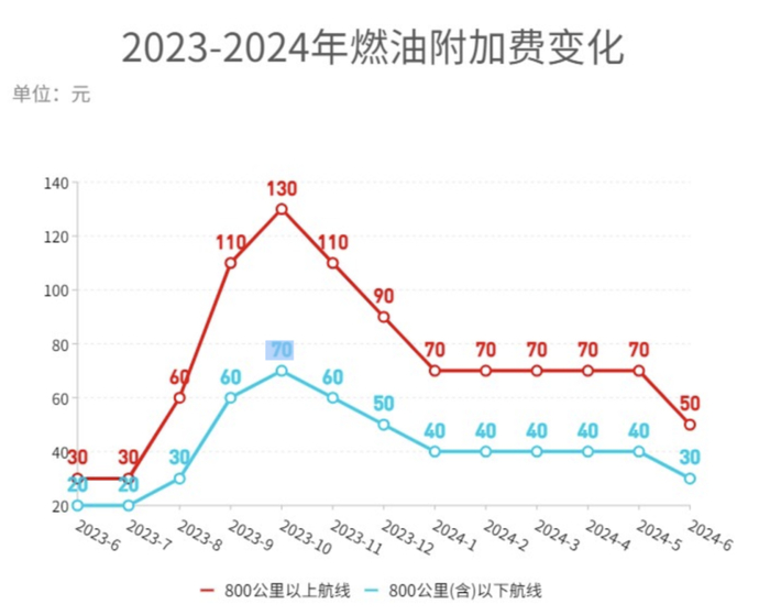 5月29日,记者获悉,自2024年6月5日(出票日期)起,成人旅客:800公里以上航线每位旅客收取50元燃油附加费,800公里(含)以下航线每位旅客收取30元燃油附加费。相较于调整前分别降低了20元和10元。