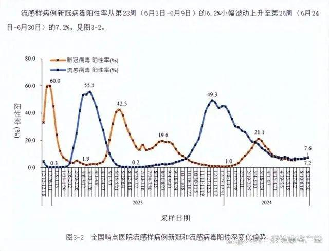 7月10日,中国疾控中心发布2024年6月全国新型冠状病毒感染疫情情况。报告显示全国哨点医院流感样病例占门(急)诊就诊人数比例小幅波动,流感样病例新冠病毒阳性率从第23周(6月3日-6月9日)的6.2%小幅波动上升至第26周(6月24日-6月30日)的7.2%。从报告数据来看,其中新冠病毒JN.1变异株XDV占比上升。