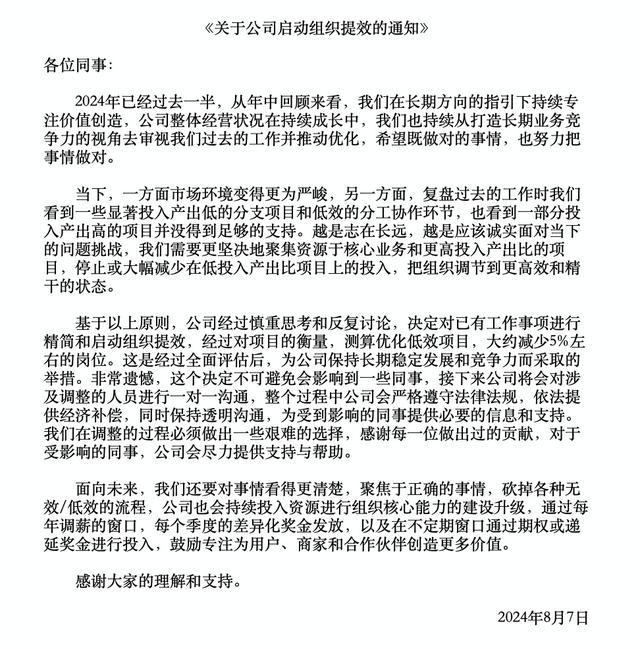 8月7日,得物App发布内部信宣布公司确认裁员,比例约5%。截至2024年一季度,得物人员规模约在10000人,5%的裁员比例意味着将有约500人被裁。此外,得物还有约上万人的外包团队。