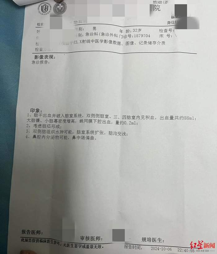 病情诊断记者采访了解到,10月6日,阿奎突发脑溢血后,被紧急送往医院,被诊断为脑干出血,因病情严重,进行了开颅手术。医生下达的病危通知书显示:阿奎脑干出血并破入脑室系统且脑室铸型;脑疝;中枢性呼吸循环衰竭。事发前,阿奎曾称最近身体实在熬不住了,他在10月6日直播的过程中称自己头痛,“不行了,我要晕了,晕过去了”,随后他便结束了直播。团队成员发现情况不对,立即将他送往医院。