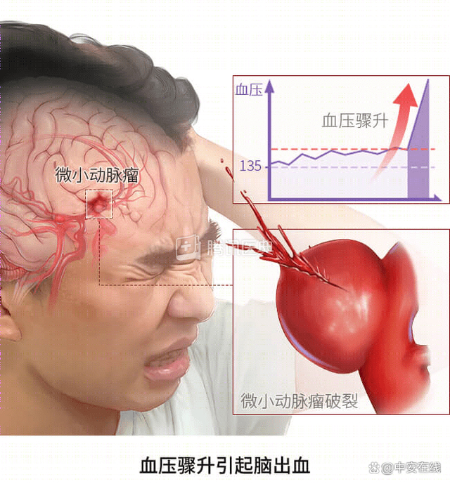 大脑内的小血管硬化,在长期高血压的影响下,血管壁变得像玻璃一样脆,而且越来越薄。一旦血压突然升高(比如酗酒、生气、熬夜工作等),就容易破裂,进而导致脑溢血。