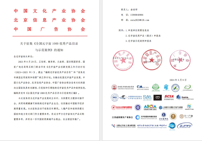 为有效推动中国元宇宙产业繁荣发展,根据国家工业和信息化部、文化和旅游部等五部门联合印发的《元宇宙产业创新发展三年行动计划(2023—2025 年)》文件要求,中国文化产业协会、北京信息产业协会、中国广告协会联合中国国际科技促进会元宇宙专委会、文创元宇宙(上海)研究院(同济大学)等权威机构、全国12个省市自治区一流行业协会社会组织、一流媒体机构、一流投资机构面向全国征集具有创新性、示范性和引领性的人工智能和元宇宙优秀产品和示范案例,编制并发布《全国AI元宇宙1000优秀产品目录与示范案例》汇编、举办全国AI元宇宙产业供需对接大会和星级供应商推荐、发布元宇宙系列白皮书或研究报告等。入编产品和案例将提交国家和地方有关部门作为重要参考,将成为甲方元宇宙相关产品采购重要参考,并将在一系列国家级高端平台展出,在全国宣传推广。