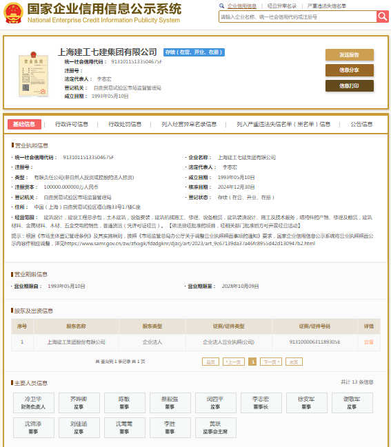 图:国家企业信用信息公示系统上海建工七建集团有限公司成立于1993年,注册资本100000万元人民币,法定代表人李志宏,由上海建工全资持股。据其官网介绍,上海建工七建集团系上海建工集团主要成员,能胜任各类大型工业、公共和民用建筑工程、装饰工程、市政工程、公路工程等总承包施工、专业承包施工和建筑工程设计。