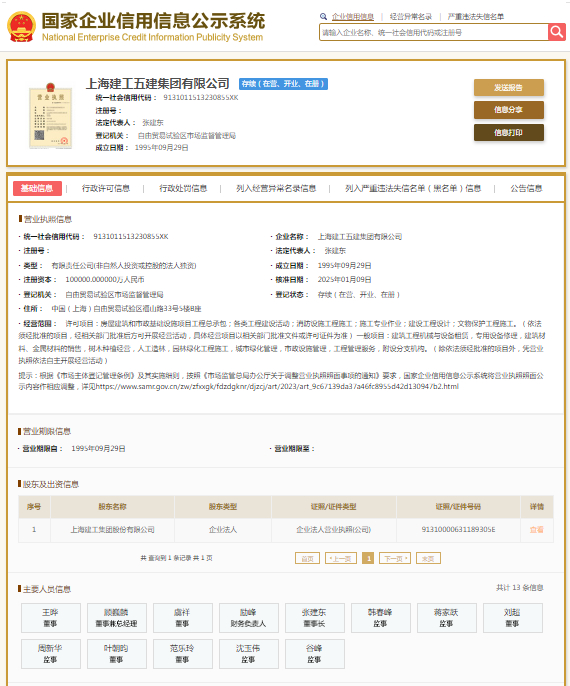 图:国家企业信用信息公示系统国家企业信用信息公示系统显示,上海建工五建集团有限公司成立于1995年,注册资本100000万元人民币,法定代表人张建东,由上海建工全资持股。据其官网介绍,上海建工五建集团系上海建工旗下骨干子集团,具有房屋建筑工程施工总承包特级资质,地基基础工程、起重设备安装工程等6项专业一级资质,以及建筑设计甲级资质、文物保护工程施工二级资质。