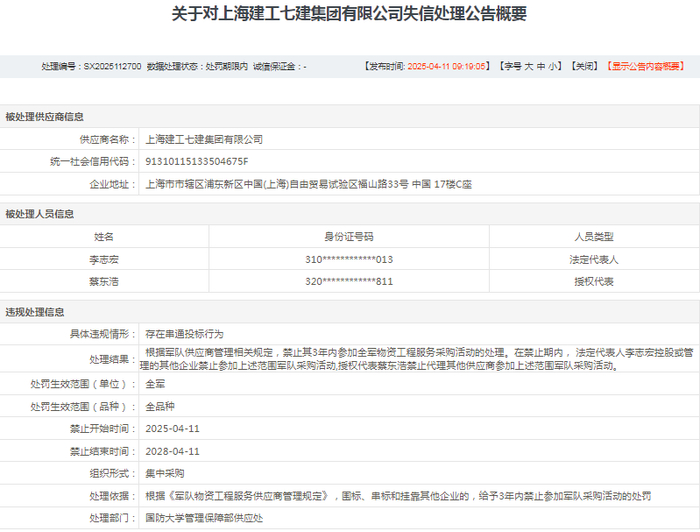 图:上海建工七建集团官网其禁止开始时间是2025年4月11日,禁止结束时间是2028年4月11日,暂停生效范围(单位)为全军,处罚生效范围(品种)为全品种,处理部门为国防大学管理保障部供应处。