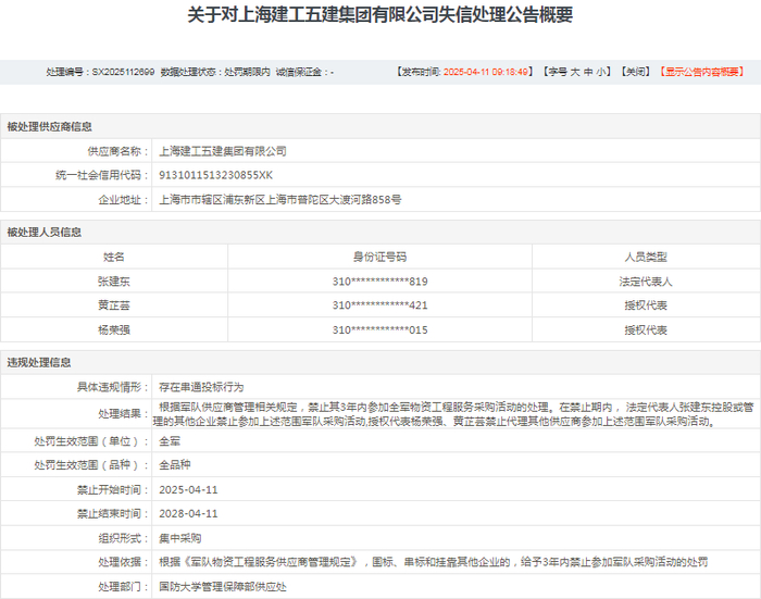 图:军队采购网关于对上海建工五建集团失信处理公告概要内容显示,上海建工五建集团具体违规情形为“存在串通投标行为”,根据军队供应商管理相关规定,禁止其3年内参加全军物资工程服务采购活动的处理。在禁止期内, 法定代表人张建东控股或管理的其他企业禁止参加上述范围军队采购活动,授权代表杨荣强、黄芷芸禁止代理其他供应商参加上述范围军队采购活动。