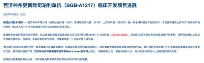 据新京报消息,百济神州有限公司(688236.SH)宣布终止其抗TIGIT抗体欧司珀利单抗(BGB-A1217)作为肺癌潜在治疗方法的临床开发项目。截至2024年上半年,百济神州在该项目中累计投入已达20.9亿元人民币。独立数据监查委员会建议终止正在进行的三期AdvanTIG-302试验,因为该研究或难以达到总生存期主要终点。尽管如此,未发现新的安全信号。