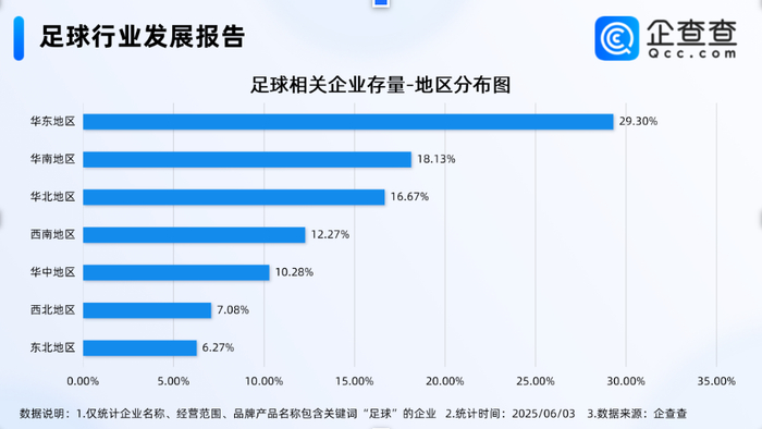 从体育产业来看,企查查数据显示,国内存足球相关企业1.76万家。从注册资本来看,足球相关企业多以轻量级为主,其中注册资本在100万元以内的相关企业最多,占比65.76%。注册量方面,2024年全年注册相关企业962家,截至目前,今年前5月已注册371家,与去年同期注册水平基本持平。从地区分布来看,分布华东地区的相关企业最多,占比29.3%。