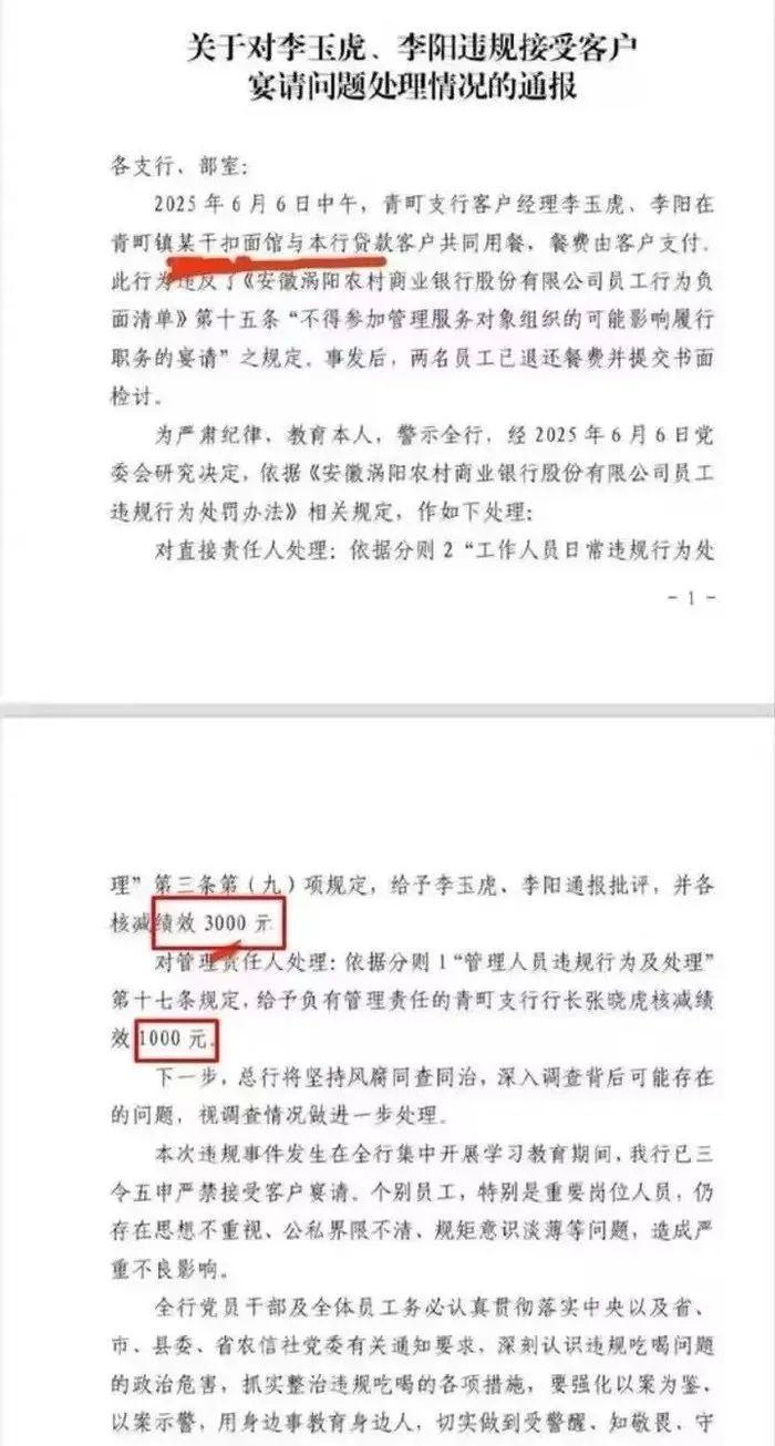 近日,一则关于安徽涡阳农村商业银行的内部处理通报近日在网络上流传,引发了金融圈内外的关注。通报内容显示,该行两名客户经理因在一家普通面馆接受贷款客户支付的一顿午餐,被通报批评及每人3000元绩效核减的严厉处罚。