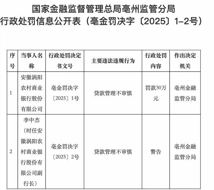 记者注意到,2025年4月,涡阳农村商业银行刚刚收到来自国家金融监督管理总局亳州监管分局的罚单。因“贷款管理不审慎”的违规行为,该行被处以30万元罚款,时任副行长李中杰则受到警告处分。