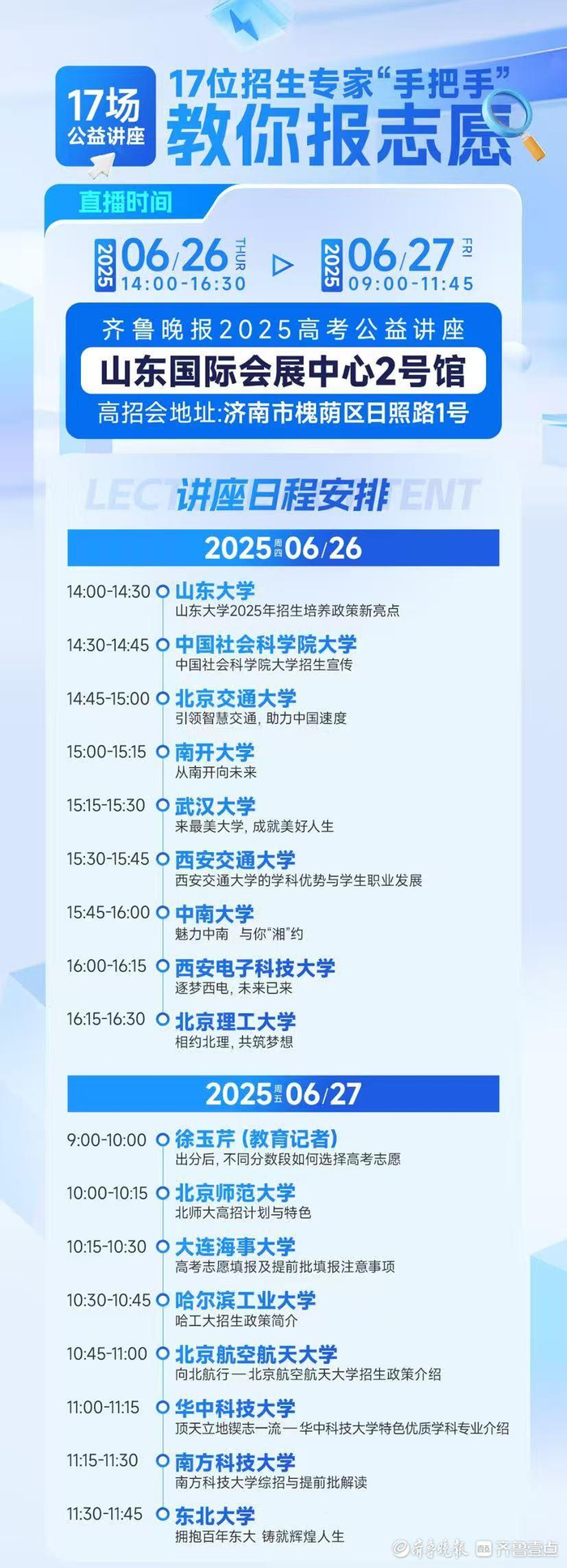 此外,6月26日下午至27日上午,2025山东高招会济南主场还安排了17场公益讲座。届时,会有17位招生专家“手把手”教你报志愿。
