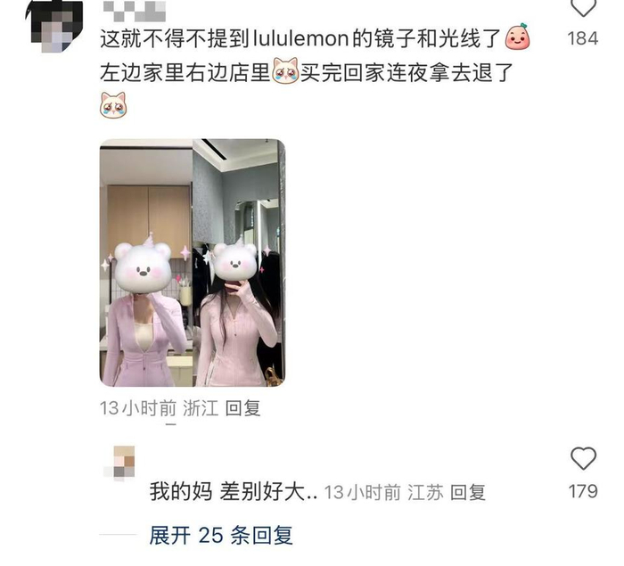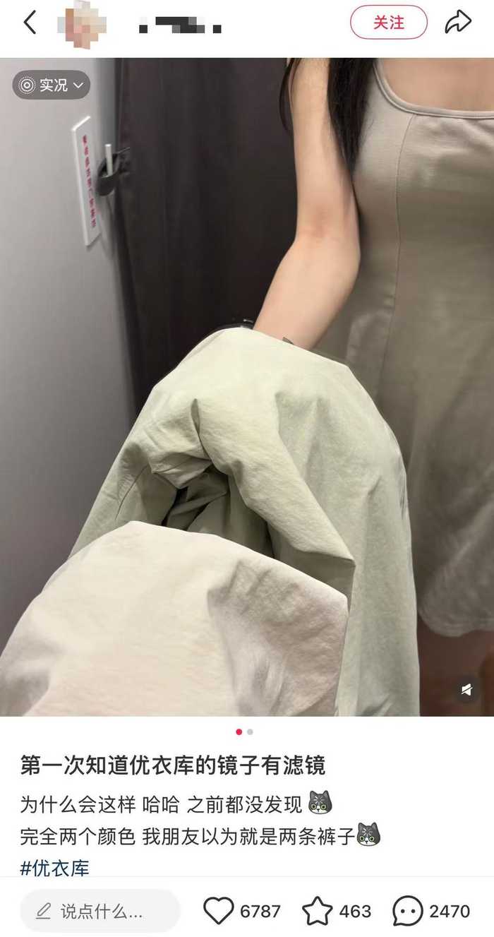 不少网友怀疑优衣库线下门店试衣镜带有“滤镜”,称在店里试穿时的裤子和出商场后色差较大。网友纷纷跟帖表示赞同:“这不得不提去年我在优衣库买的一身白,店里很仙,出门发现上衣和裤子是五彩斑斓的白”,也有网友分享自己在Lululemon购买的外套,颜色也有很大的差别。