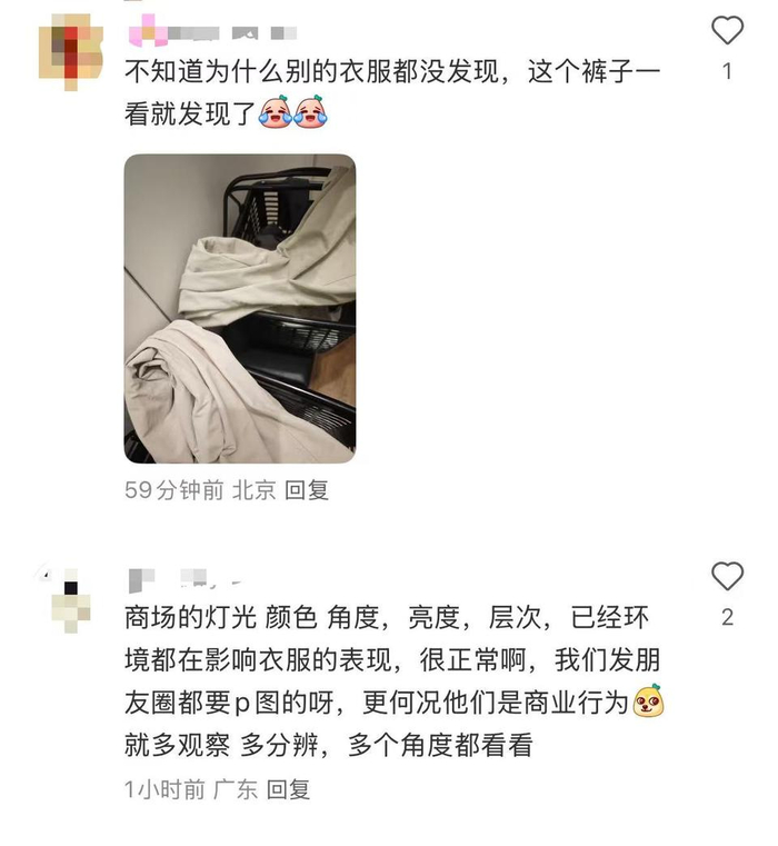 有网友科普:商场的灯光、颜色、角度、亮度、层次,已经环境都在影响衣服的表现,很正常,我们发朋友圈都要p图的呀,更何况他们是商业行为。就多观察、多分辨,多个角度都看看。