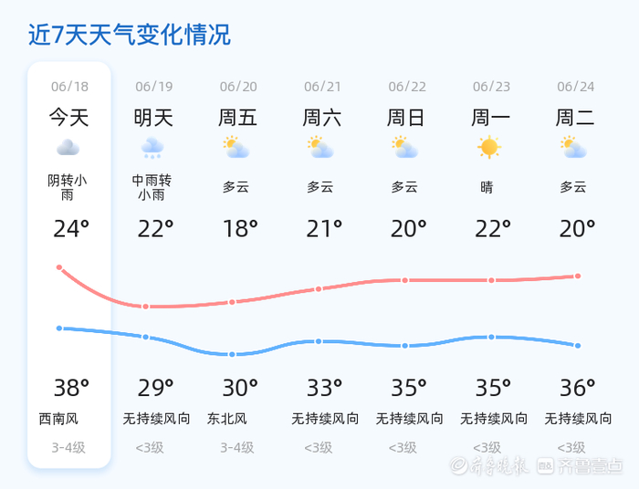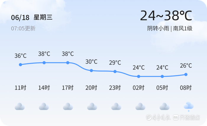 今天是6月18日,星期三,农历五月廿三。滨州今日天气为阴转小雨,气温在24℃至38℃之间,南风1级,空气湿度51%,PM2.5指数为42,空气质量良好。全市各区天气情况一致,均为阴转小雨,南风1级,气温在24℃至38℃之间。市民出行请注意携带雨具,注意防雨防晒。
