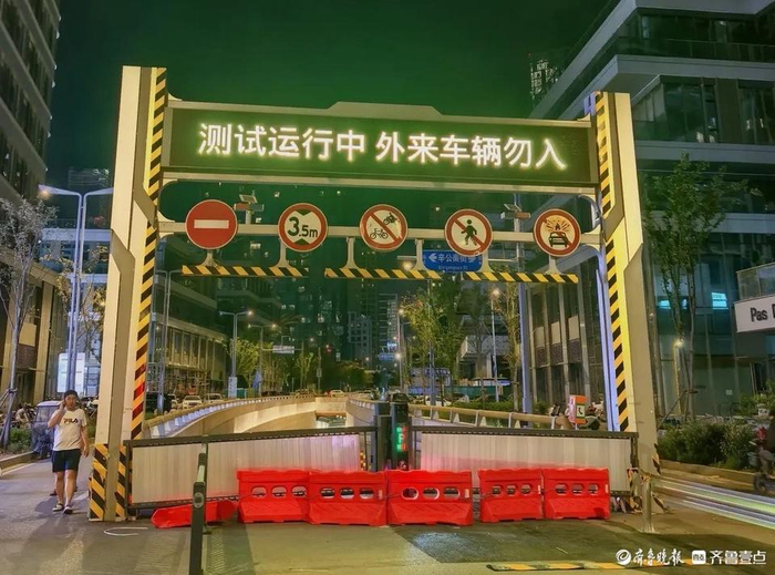 近日,记者来到济南中央商务区的地下环路A口,门口处的电子指示牌写道:测试运行中,外来车辆勿入。现场还设置围挡。